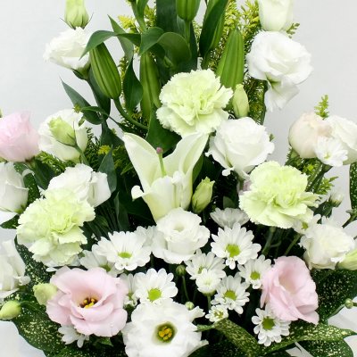 ・商品名 白ユリとトルコキキョウの清楚な感じのお供え花