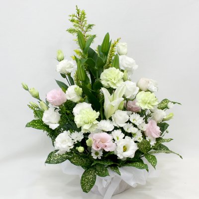 淡い色合いの清楚なお供えアレンジメント
